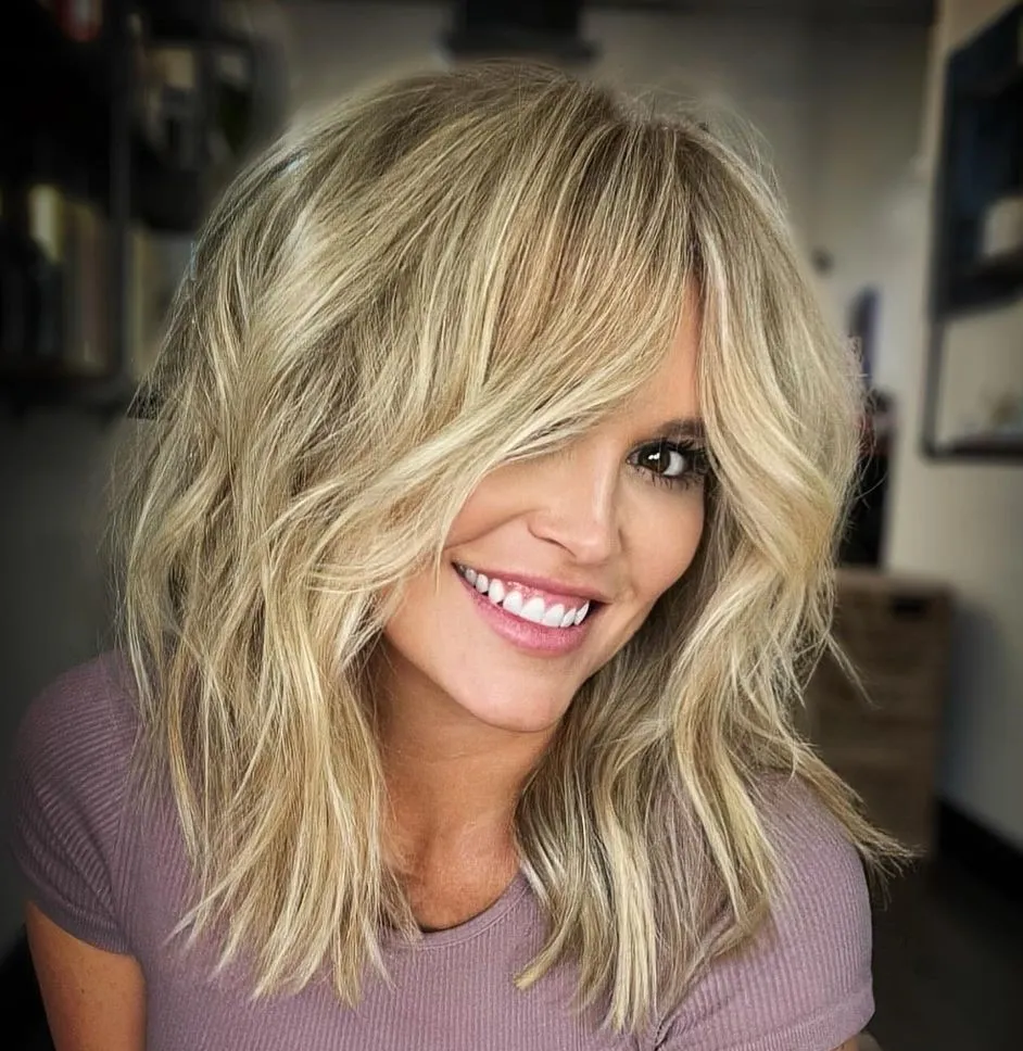 Luminous blonde highlights blend seamlessly with a warm honey base to create an energetic and dimensional look. Strategic face framing layers sweep across the eyes to add a touch of mystery while softening the overall profile. This specific silhouette thrives on natural movement, making it a standout choice for messy hairstyles for every hair length.