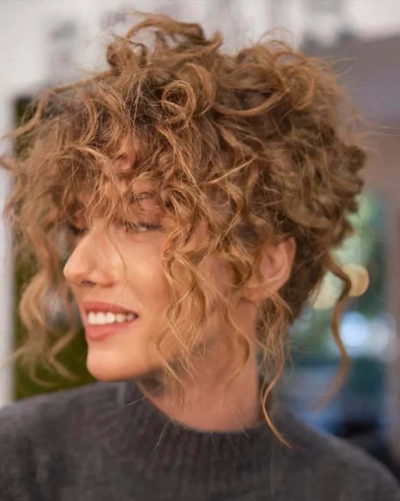 Unconventional styling choices like leaving the forehead mostly covered by loose ringlets add a touch of artistic mystery. You should avoid heavy brushes that might break the delicate curl pattern or create unwanted, flat sections. Final touches include a light mist of shine spray to highlight the warm golden undertones and keep the deconstructed shape vibrant.