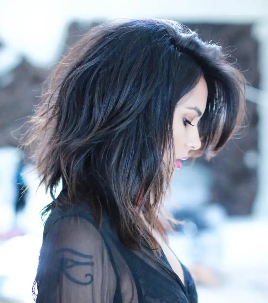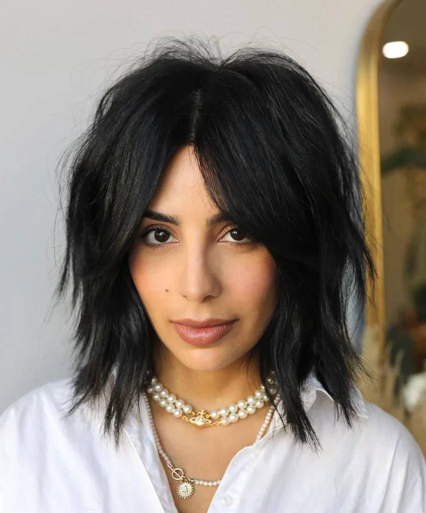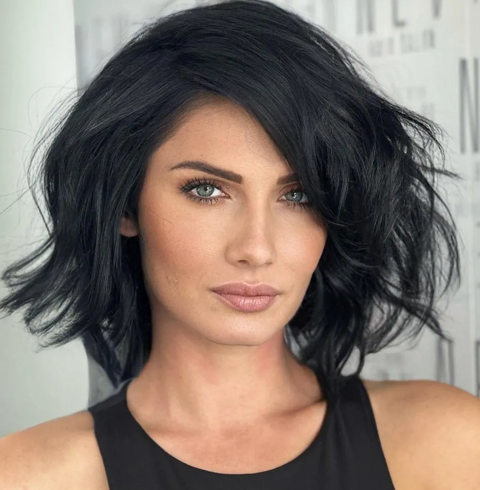 Luminous obsidian tones enrich this striking shoulder-length cut, showcasing how deep color can amplify the visual impact of messy hairstyles for every hair length. Choppy, face-framing layers are cut throughout the silhouette to ensure the dark hue never appears heavy or stagnant. This specific style relies on a deep side part to create a dramatic sweep of hair that highlights the jawline beautifully.