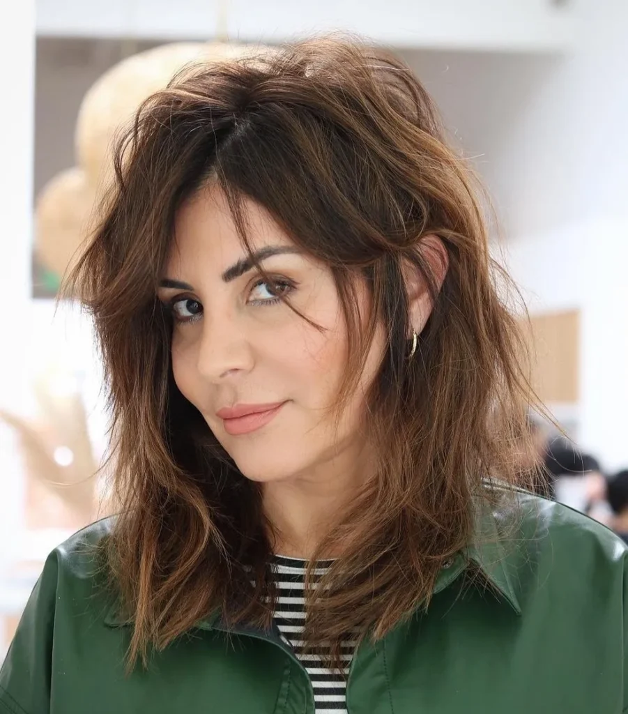 Radiant chestnut base tones blend with lighter honey ribbons to create a vibrant, multidimensional effect. Strategic highlights emphasize the textured ends, making this one of the most popular messy hairstyles for every hair length. This side-swept silhouette focuses on asymmetrical volume to provide a fresh, modern frame for the face.