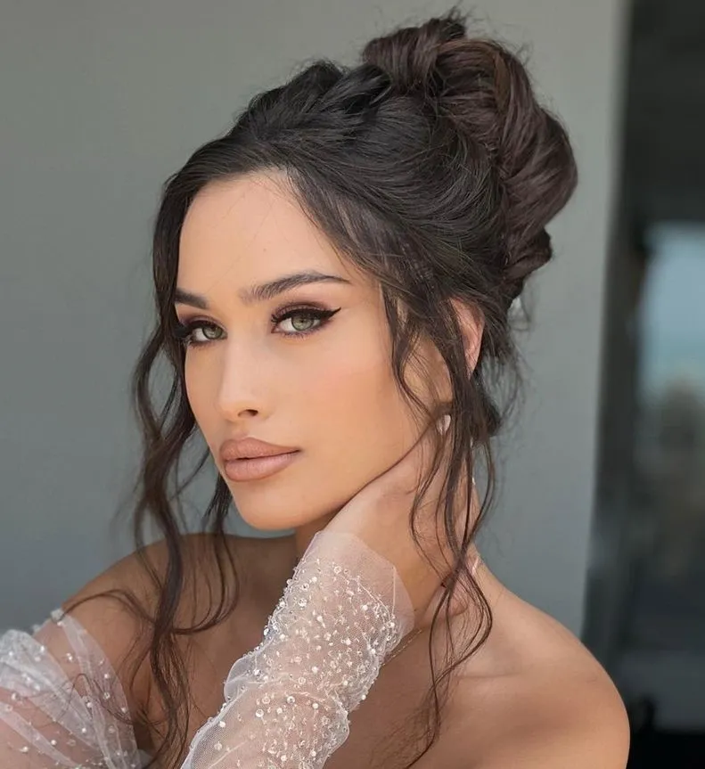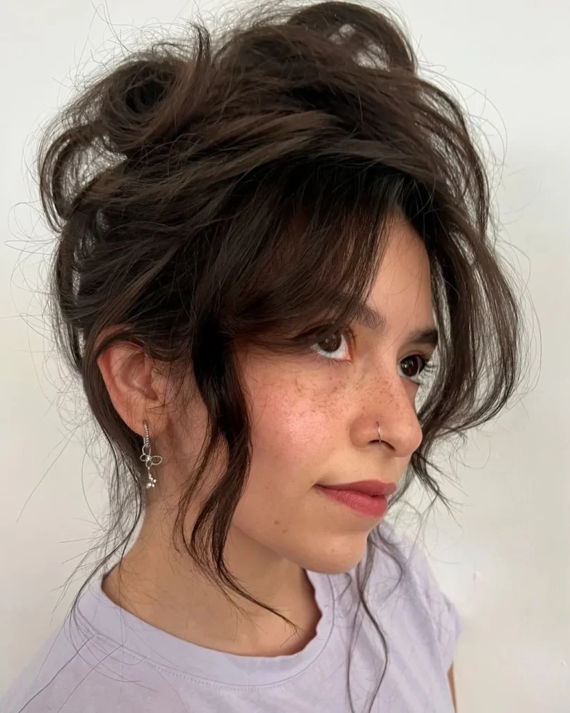 Luminous mocha tones swirl together in this elevated updo, showcasing how height can transform messy hairstyles for every hair length. Long, curtain bangs sweep gracefully away from the face to create a soft, romantic frame for the features.
