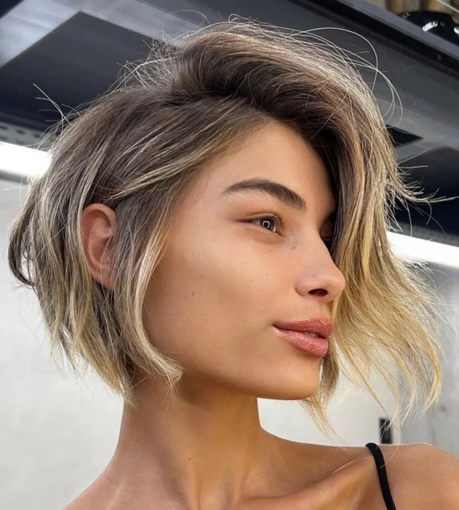 Luminous blonde highlights concentrate at the ends to provide a striking contrast against the deeper brunette roots. Choppy layers throughout the length ensure this look remains one of the top messy hairstyles for every hair length. This side-profile view showcases how a deep part creates a dramatic, sweeping fringe that adds mystery to the eyes.