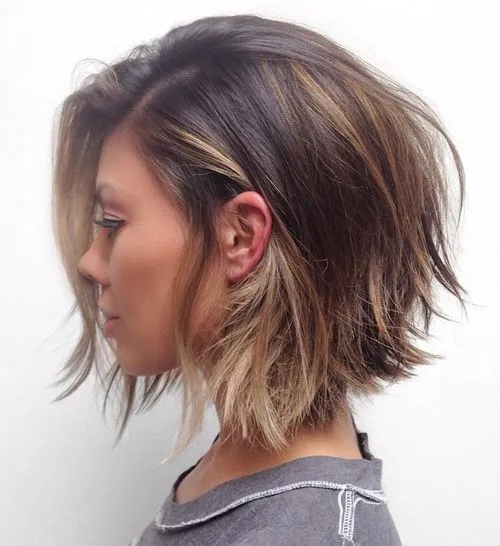 Jagged layers are cut throughout to remove weight and add a playful bounce to the shorter strands. Styling this look works best when you apply a volumizing mousse to the roots before air-drying. Small sections around the ear can be tucked back to showcase the intricate contrast between the dark and light shades.