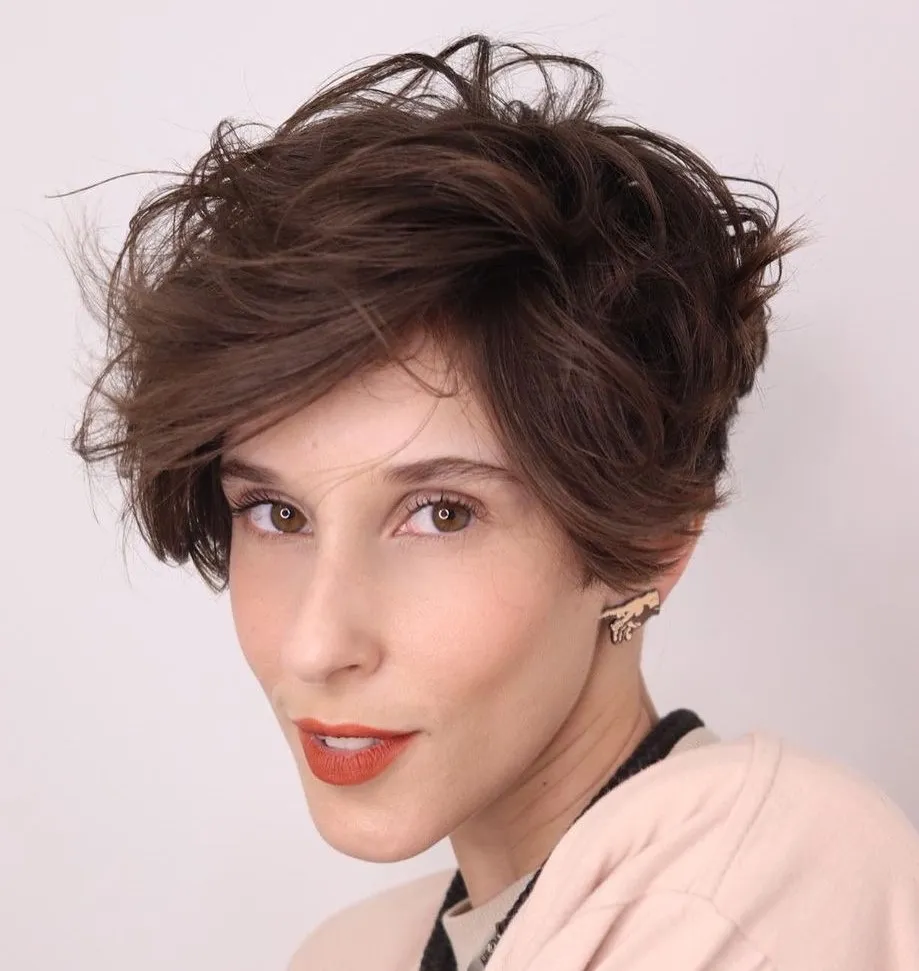 Luminous cocoa tones enrich this daring short cut, showcasing how choppy layers create dynamic volume. Asymmetrical styling allows longer sections to sweep across the forehead, providing a soft frame for the eyes. This specific silhouette thrives on a spirited, wind-swept finish that feels modern and effortlessly cool.