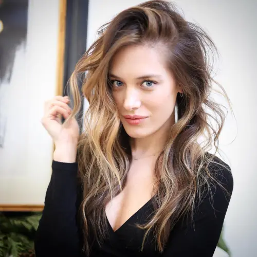 Cascading waves tumble over one shoulder while a deep side part adds immediate volume and drama at the roots. Sun-kissed highlights dance through the honey-brown strands to catch the light beautifully during a candlelit dinner.