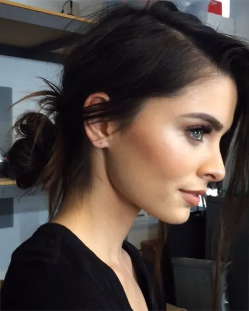 Atheling-like charm defines this relaxed updo, making it a stellar choice among romantic hairstyles for date nights. Deep espresso locks are gathered loosely at the nape of the neck to create a soft, textured bun. Wispy tendrils frame the face beautifully, adding a touch of intentional whimsy to the overall silhouette.