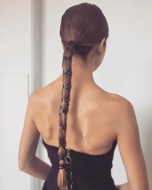 Symmetry defines the intricate lacing pattern that extends from the nape of the neck down to the very tips. Each cross of the cord cinches the ponytail to produce a bold visual rhythm that catches the eye instantly. Choosing a contrasting tie color ensures the unique structural details stand out against the natural warmth of the hair.