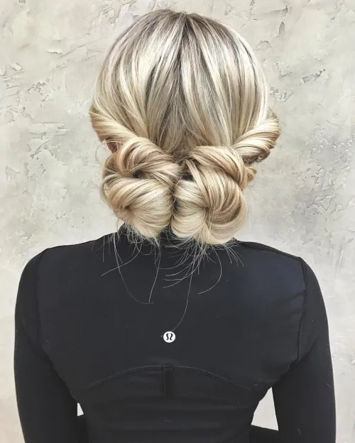 Exquisite textures define this elegant look, making it a standout choice for an evening out. You begin by parting your hair down the middle to ensure symmetry across both sides. Gentle twists along the hairline guide the eye toward the nape where the magic happens. Soft blonde tones catch the light beautifully within these intricate, coiled knots.