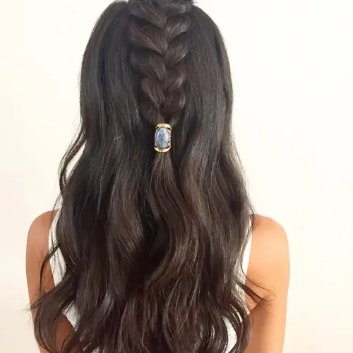 Ornate accessories like the blue stone clip shown here serve as a focal point for the entire ensemble. Securing the end of the plait with a decorative piece hides elastics while adding a touch of vintage glamour. You can easily transition this style from a day at the office to a fancy evening dinner.