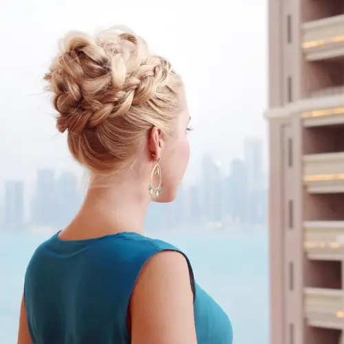 Intricate weaving creates a crown of golden strands that encircles the head with effortless grace. This textured arrangement keeps hair securely off the neck while maintaining a soft and approachable aesthetic. High volume at the top ensures your profile remains striking and elegant throughout the entire evening.