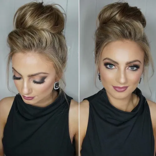 Aesthetics aside, achieving such height often requires light backcombing and a touch of texturizing spray to maintain the structural integrity. Sweeping the hair upward provides a natural lifting effect for the eyes, which complements dramatic smokey eye makeup beautifully. Subtle highlights within the blonde tones add depth, making the intricate twists of the bun visible even in low light.