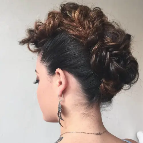 Ornate loops of chestnut hair intertwine to form a faux-hawk that feels sophisticated and remarkably modern. Using small pins keeps the silhouette secure, while light hairspray ensures those delicate ringlets stay bouncy throughout your dinner. Highlights peek through the dark base to give the entire look a sense of movement and dimension under soft lighting.