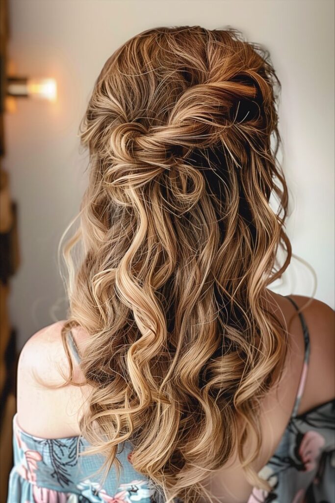 Luminous honey-blonde strands are gathered from the temples and secured in a relaxed, interlaced knot at the back of the head. This specific arrangement allows for a beautiful contrast between the structured top section and the voluminous, free-flowing curls below. Such a style keeps hair away from your face while showcasing a lengthy, multi-dimensional look for your evening outing.