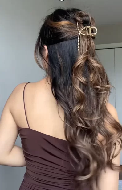 Glistening embellishments take center stage as a dainty, rhinestone-encrusted claw clip secures the top section with ease. Opting for this choice among romantic hairstyles for date nights allows you to look polished without spending hours in front of a mirror. Simply gather the upper half of your hair, give it a small twist, and clamp the decorative accessory firmly in place.