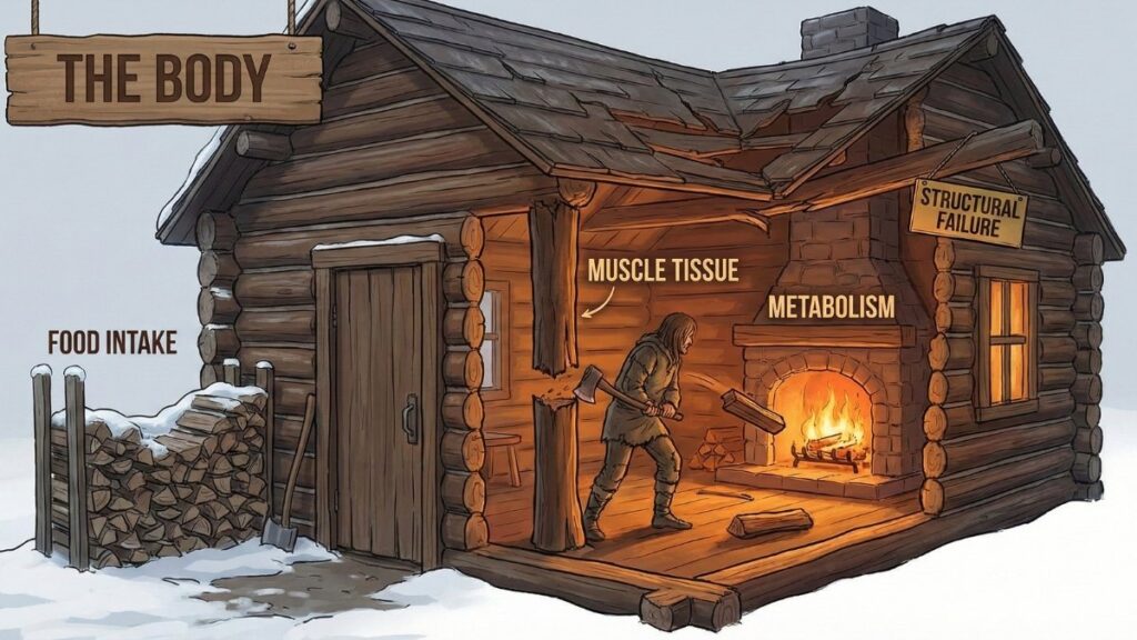 Some people think eating less always equals better results. They're wrong. Your body needs energy to build muscle. When you don't eat enough, your body goes into survival mode. It starts breaking down muscle tissue to meet its energy needs.