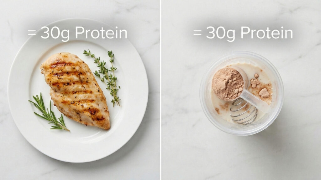 Here's a real example. Say you weigh 150 pounds. That's about 68 kilograms. You need 82 to 109 grams of protein per day. With 25 to 30 grams right after your workout. That's roughly 4 ounces of chicken breast. Or 1.5 scoops of whey protein.