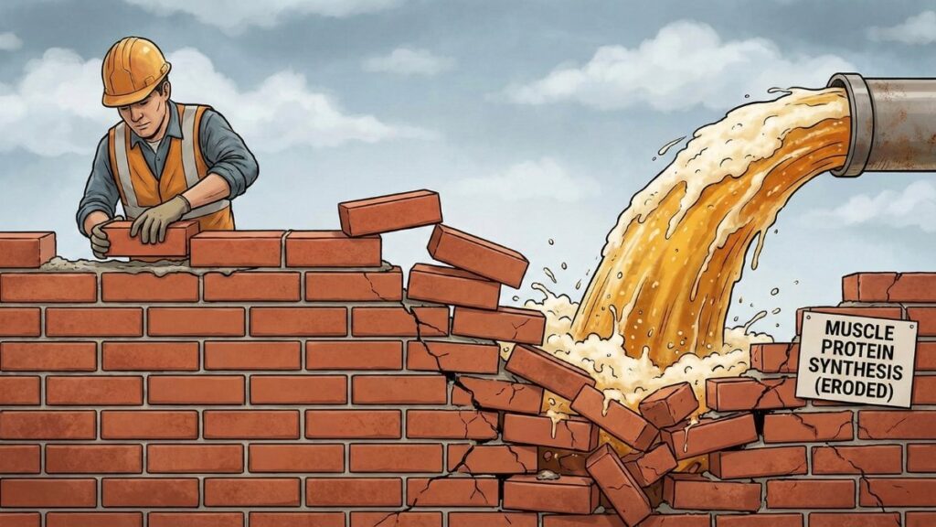 But alcohol does more than just block protein synthesis. It increases cortisol levels. It decreases testosterone. This creates an imbalance between building up (anabolic) and breaking down (catabolic) processes.