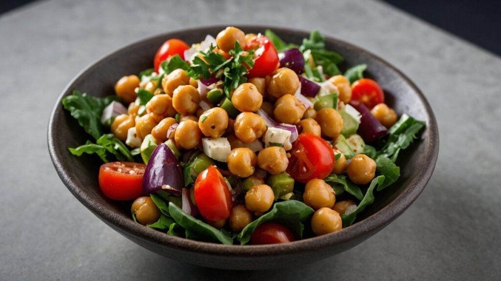 Mix 1 cup of chickpeas, diced cucumber, cherry tomatoes, red onion, and kalamata olives. Add ¼ cup crumbled feta cheese. Dress with olive oil, lemon juice, and oregano.
