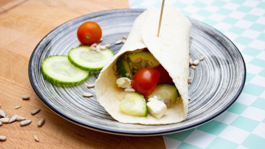 Spread 3 tablespoons of hummus on a whole-wheat tortilla. Add 3 ounces of sliced turkey, cucumber slices, and shredded lettuce. Roll it up.